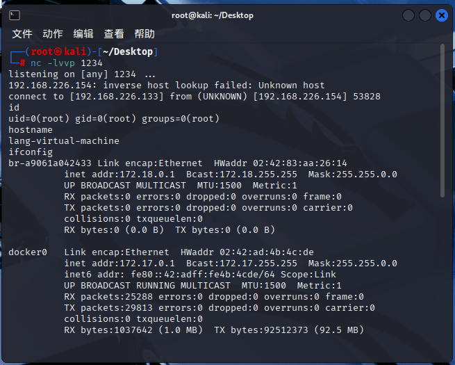 nc -lvvp 1234 # 监听1234端口,等待容器连接
