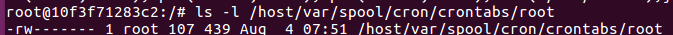 cat /host/var/spool/cron/crontabs/root # 确认命令已写入 ls -l /host/var/spool/cron/crontabs/root # 权限应为 -rw-------