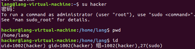 id显示uid=1002(hacker) gid=1002(hacker) 组=1002(hacker),27(sudo),表明具备 sudo 权限。 -